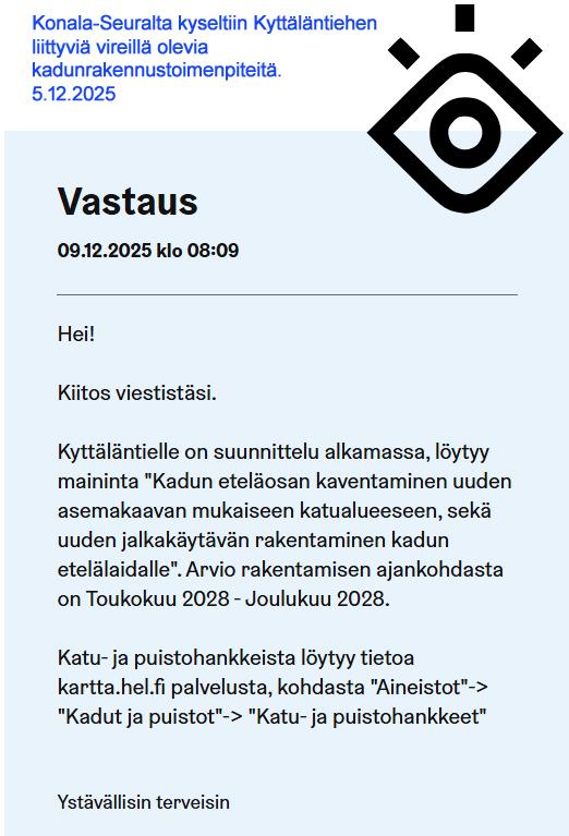 HSL on aloittanut Länsi-Helsingin bussilinjaston suunnittelun tilanteeseen, jolloin länsiratikoiden liikenne on käynnistynyt 2030-alkupuolella. Suunnittelu on edennyt vaiheeseen, jossa olemme tuottaneet linjastosta luonnoksen. Lisää tietoa linjastoluonnoksesta ja linkki kyselyyn: 4. blogi: Länsi-Helsingin linjastosuunnitelman linjastoluonnos on julkaistu | Länsi-Helsingin linjastosuunnitelma | HSL | HSL.fi. Vastausaikaa 18.1.2026 asti.